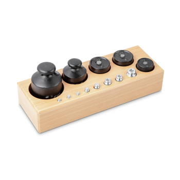 Sarja sylinterin mallisia painoja, jotka ovat messinkiä ja lakattua valurautaa. Puinen säilytystukki.